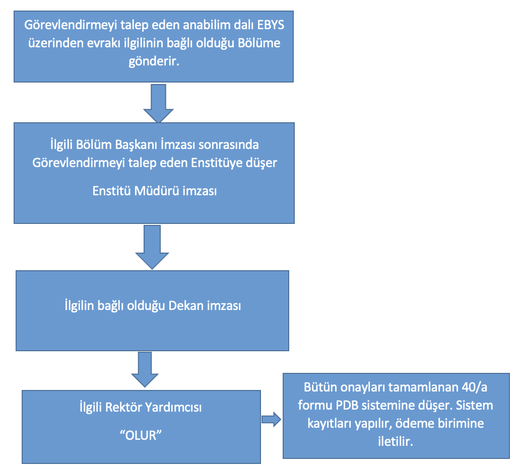 Evrakların EBYS üzerinden düzenlemesi gerekmekte olup görevlendirmeyi talep eden anabilim dalı işlemi başlatacak olup imza sırası da aşağıdaki sıraya yapılacaktır.
